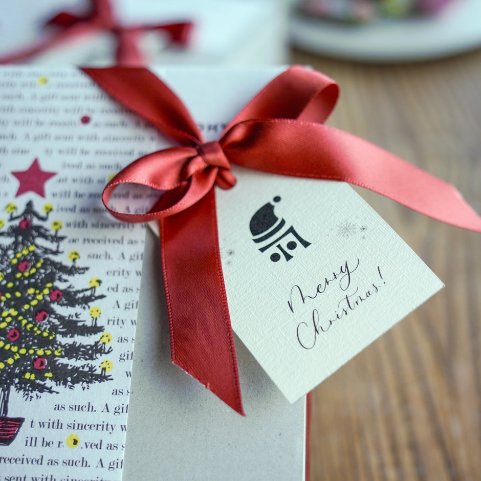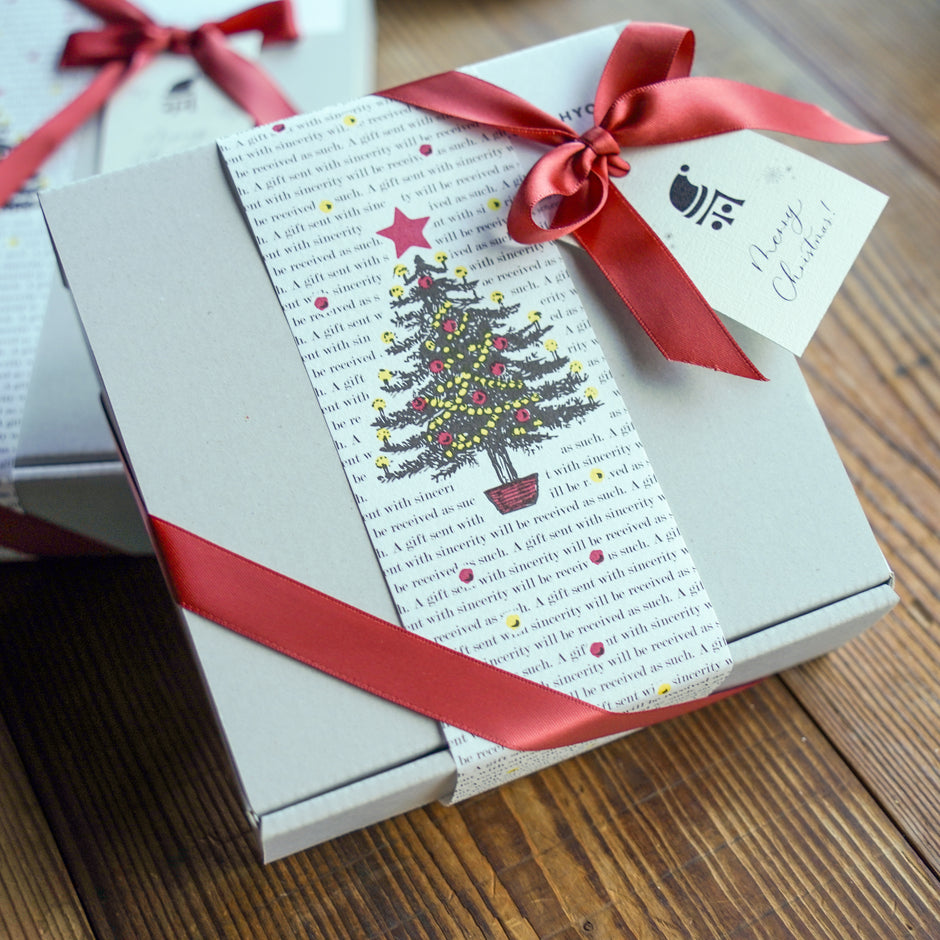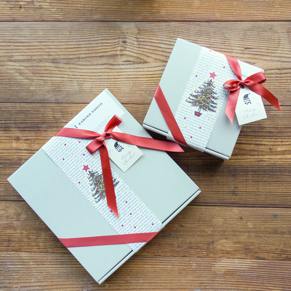 うつわの箱をクリスマス仕様の巻紙で巻き、